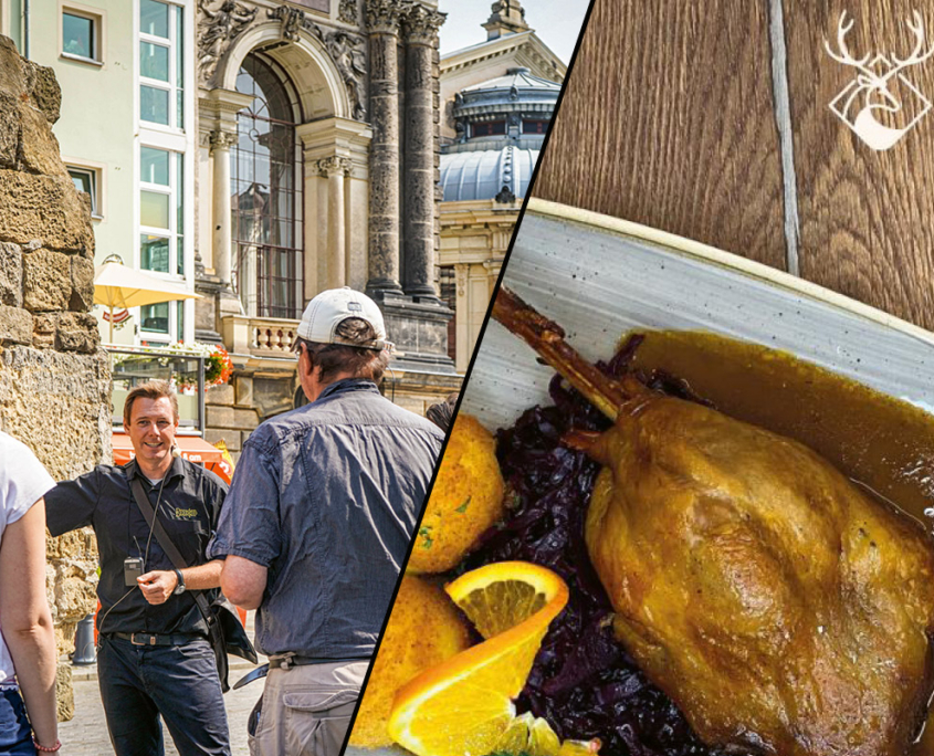 Anschließend kehren Sie in ein typisches Gasthaus mit gemütlicher und stilvoller Atmosphäre mitten in der Altstadt ein. Hier genießen Sie ein traditionelles Festmahl und beobachten ganz nebenbei das Treiben in der Dresdner Innenstadt. Wir servieren Ihnen eine zart knusprige Gänsekeule, klassisch mit sächsischen Kartoffelklößen mit Semmelbutter und Apfelrotkohl. Wahlweise genießen Sie zu dem Gericht einen edlen Grauburgunder, ein erfrischendes Fassbier oder ein alkoholfreies Getränk.